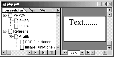 Mit pdf_add_outline() fügt man innerhalb eines PDF-Dokuments (PDF-Dokument) ein Lesezeichen (Text) für die aktuelle Seite hinzu. Das Lesezeichen funktioniert, ähnlich wie ein Eintrag im Inhaltsverzeichnis, als Sprungmarke zu einer bestimmten Seite. Rückgabewert der Funktion ist die ID des neuen Lesezeichens. Sie können Lesezeichen hierarchisch sortieren. Jeder neuen Hauptgruppe (Mutter) können Sie weitere Untergruppen zuordnen, welche wiederum eigene Untergruppen besitzen können. Eine Untergruppe kann so also auch zu einer Hauptgruppe werden und weitere Lesezeichen umfassen. Wenn Sie ein Lesezeichen oder eine neue Untergruppe anlegen wollen, können Sie im Parameter Mutter die ID der übergeordneten Gruppe angeben, zu der das Lesezeichen bzw. die Untergruppe gehören soll. Sie können mit dem optionalen Parameter offen bestimmen, ob das Inhaltsverzeichnis einer bestimmten Gruppe beim Öffnen des PDF-Dokuments aus- oder eingeklappt sein soll. Soll das Inhaltsverzeichnis ausgeklappt sein, so brauchen Sie nur für offen einen Wert ungleich 0 (Null) angeben. Der optionale Parameter offen ist aber nur im Zusammenhang mit einer Gruppe (Mutter) erlaubt. Da aber die oberste Hauptgruppe (das erste Lesezeichen) keine "Mutter" besitzt, können Sie einfach einen nicht existenten Rückgabewert (im Beispiel $_x) als Gruppen-ID verwenden.