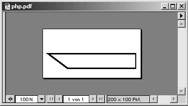 Mit pdf_closepath() schließt man in einem PDF-Dokument (PDF-Dokument) den Zeichenpfad. Dabei wird das Ende des aktuellen Pfades mit dem Anfang des Pfades verbunden. Im unteren Beispiel wurde der erste Pfad mit einer horizontalen Linie nach rechts begonnen. Die zweite Linie begann automatisch am Ende der ersten Linie und zog sich in vertikaler Richtung nach unten. Die dritte Linie begann wieder am Ende der zweiten Linie und zog sich in horizontaler Richtung von rechts nach links. Danach wurde der Pfad abgeschlossen und das Ende der dritten Linie schloss sich zusammen mit dem Anfang der ersten Linie.