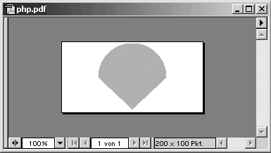 Mit pdf_closepath_fill_stroke() schließt man einen Pfad innerhalb eines PDF-Dokuments (PDF-Dokument) und füllt das Innere des aktuellen Pfades mit der aktuell zugewiesenen Farbe. Zusätzlich zum Füllen wird entlang des Pfades eine Linie gezeichnet.Im unteren Beispiel wurde ein Bogen mit 180° entgegen dem Uhrzeigersinn gezeichnet. Am Ende des Pfades wurde danach eine diagonale Linie bis zum unteren Rand der Seite gezogen. Mit pdf_closepath_fill_stroke wurde danach der Innenraum gefüllt und eine Linie entlang des Pfades gezeichnet.