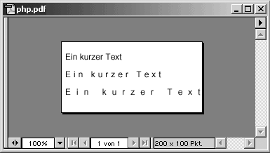 Mit pdf_set_char_spacing() kann man innerhalb eines PDF-Dokuments (PDF-Dokument) den Raum zwischen zwei Zeichen (Abstand) bestimmen. Im unteren Beispiel wurde dreimal der gleiche Text gezeichnet - einmal mit Abstand 0 (normal), einmal mit Abstand 4 und einmal mit einem Abstand von 8. Es ist zu berücksichtigen, dass diese Funktion seit der PHP-Version 4.0.2 als "deprecated" gilt und in späteren Versionen eventuell nicht mehr verfügbar sein wird. Sie sollten daher in Zukunft die Funktion pdf_set_value() nutzen und dort als zweiten Parameter "charspacing" einsetzen.