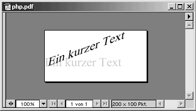 Mit pdf_skew() schert man das Koordinatensystem für alle folgenden PDF-Funktionen in alpha(x)- und beta(y)-Richtung. Dabei sind die Werte für alpha(x) (alpha) und beta(y) (beta) in Grad anzugeben. Wenn Sie Scherwerte größer 0 einstellen, wird sich bei der Textausgabe mit pdf_show_xy() auch der Ursprung des Textes in X- und Y-Richtung verschieben. Beim unteren Beispiel wurde das Koordinatensystem um 20° in X- und 10° in Y-Richtung geschert. Dabei hat sich der Text um den Wert 6 (sechs) zusätzlich auf der horizontalen X-Achse verschoben.