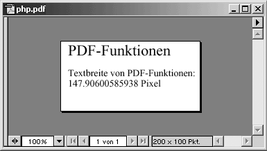 Achtung: Bei der Ausgabe des Befehls wird im Browser nichts zurückgegeben. Die obenstehende Grafik wurde im Acrobat-Reader geöffnet um die Wirkungsweise des Befehls zu zeigen. Sie können sich aber die Textbreite am Browser mit "echo $width;" ausgeben lassen. |