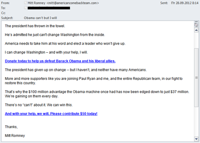 Im dritten Quartal 2012 beobachteten wir eine Vielzahl von Versendungen mit politischer Ausrichtung. Bis zu den amerikanischen Präsidentschaftswahlen am 6. November nahm ihre Zahl stetig zu. Auch die Menge von schädlichen Versendungen stieg an, die das Interesse der User an den Wahlen ausnutzen.