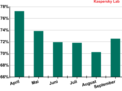 Die Grafik zeigt einen für den Sommer typischen Rückgang des Spam-Anteils sowie eine geringe Zunahme dieses Wertes im September. Fast jedes Jahr ist ein solcher Anstieg im Herbst zu beobachten: Die Ferien sind zu Ende, die Leute verbringen wieder mehr Zeit im Internet und die Werbungsgeber versuchen, wieder mehr Reklame in Umlauf zu bringen, darunter auch im Spam. Doch trotzdem zeichnet sich deutlich eine allgemeine Tendenz zum Rückgang des Spam-Anteils ab.