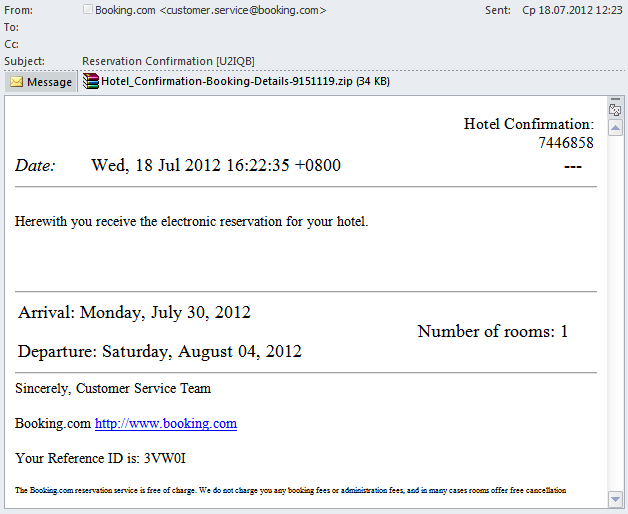 Während Cyberkriminelle im vorangegangenen Quartal mit Vorliebe Bestätigungsmails über den Kauf von Flugtickets versendeten, so erfreuten sich im dritten Quartal gefälschte Benachrichtigungen über Buchungen von Hotelzimmern größter Beliebtheit unter Online-Betrügern.