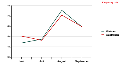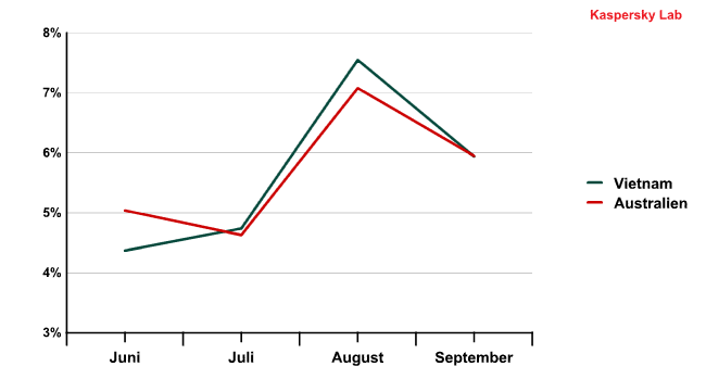Interessant ist auch die Versendungsdynamik von Schadcode auf dem Gebiet von Vietnam und Australien: Im Laufe des gesamten Quartals entwickelten sich die Werte dieser Länder praktisch identisch.