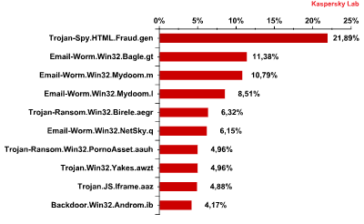 Die E-Mail-Würmer Bagle.gt, Mydoom.m und Mydoom.l belegen im Rating die Plätze zwei und drei respektive vier. Der Wurm Netsky.q blieb ein wenig hinter seinen Artgenossen zurück und landete auf Position sechs. Zur Erinnerung: Die Standardfunktionalität von Würmern besteht auf einem infizierten Computer im Sammeln von E-Mail-Adressen und dem anschließenden Selbstversand dorthin. Bagle.gt ist der einzige von den aufgeführten vier Schädlingen, der mit einer zusätzlichen Funktionalität ausgestattet ist: Er kann sich mit dem Internet verbinden und andere Schadprogramme auf den Computer laden.