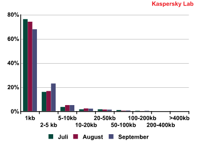 Im dritten Quartal 2012 überwogen wie üblich die sehr kleinen Spam-Mails (1 KB und weniger). In der Regel befindet sich im Körper solcher Nachrichten eine kurze Textpassage sowie ein Link auf eine Webseite, auf die der Nutzer gemäß Plan der Spammer surfen soll. Im September registrierten wir eine Zunahme der etwas größeren unerwünschten Nachrichten (2 bis 5 KB). Das hängt damit zusammen, dass im Herbst die Menge an Bestell-Spam von kleinen und mittelständischen Unternehmen zunimmt. Solcher Spam enthält in der Regel mehr Informationen im Mail-Körper. Partner-Spam hingegen dürfte immer einen Link enthalten, da die Einnahmen des Spammers von der Zahl der Anwender abhängen, die auf den Link klicken.
