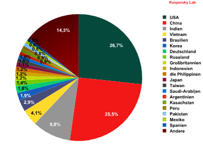 Im dritten Quartal stieg der Anteil der aus China (plus 6,7 %) und den USA (plus 15 %) versendeten unerwünschten Nachrichten deutlich. Zusammen sind diese zwei Länder für mehr als die Hälfte des weltweiten Spam-Aufkommens verantwortlich.
