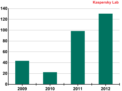 Im Jahr 2012 fügten unsere Antiviren-Experten den Datenbanken von Kaspersky Lab 30 Prozent mehr Signaturen zur Erkennung verschiedener Mac-Trojaner hinzu als im Jahr 2011. Verglichen mit dem Jahr 2010 hat sich die Anzahl der pro Jahr hinzugefügten Signaturen versechsfacht.