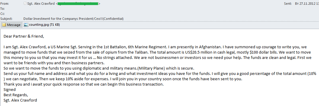 Vor diesem Hintergrund wirkte die vorgeblich von einem amerikanischen Soldaten stammende Nachricht nicht ungewöhnlich, dem es angeblich gelungen war, Geld von den Taliban zu erbeuten, das diese beim Opiumhandel verdient hatten. Die Spammer schlugen den Mail-Empfängern vor, das „verdiente“ Geld gemeinsam zu investieren, da es ihnen hierin an Erfahrung mangele.