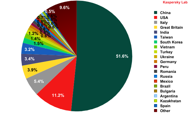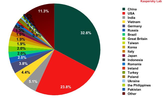 Die Hitliste der Spam-Herkunftsländer weltweit wird nach wie vor von China (32,7%) und den USA (23,8%) angeführt. Der Anteil der unerwünschten Mitteilungen, die aus China stammen, stieg um 2 Prozentpunkte, während der Prozentsatz der aus den USA versendeten Spam-Mitteilungen um 3,5 Prozentpunkte zurückging. Insgesamt wurden im November aus diesen zwei Ländern um die 56% des weltweiten Spam-Aufkommens verschickt.