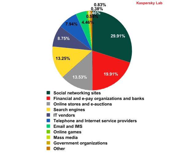 Das Kategorien-Ranking der von Phishern angegriffenen Organisationen wird auf Grundlage der Alarme der Anti-Phishing-Komponente auf den Computern der Teilnehmer des Kaspersky Security Network (KSN) erstellt. Das Anti-Phishing-Modul erkennt alle Phishing-Links, die Anwender aufrufen, wobei die Links in einer Spam-Mitteilung oder im Internet platziert sein können.