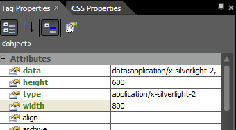Click the white placeholder. This represents the Object tag for your Silverlight application. In the Attributes section of your Tag Properties window, change the height to 600 and the width to 800.