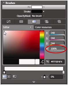 The Properties panel offers you the opportunity to apply Fill Brushes as well as Stroke Brushes. You can select different colors, and gradients in which you can set the fill or stroke for an object. In this example you will set the fill of the rectangle object to be a gradient.