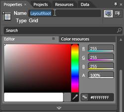 At the top of the Properties panel there is a text field labeled Name. The value of this field is LayoutRoot. One method for changing an object’s name is by typing it directly in this text field. Below the Name field is an indication of the elements type. In this case the LayoutRoot element is a grid. This is the default, but since you’ll be working with canvases in this section, you’re going to change the type of this element.