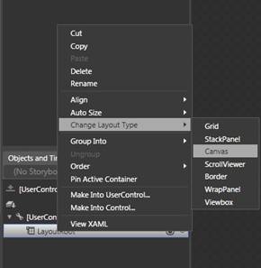 Right-click the LayoutRoot element in the Objects and Timeline panel. In the context menu that appears, choose Change Layout Type > Canvas.