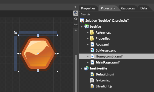 You are now in the Honeycomb. Notice that when you created this control that a new XAML document was added, named Honeycomb.xaml and placed in your Projects panel.