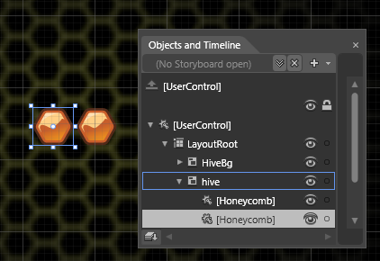 While in the MainPage.xaml, look in the Objects & Timeline panel to see that the HexShape object has now been changed into the UserControl, Honeycomb.