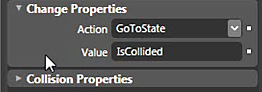 In the Properties Panel, locate the Change Properties section, then click the Action menu and choose GoToState, then type the value IsCollided. Now the Collision code we referred to earlier will be satisfied, whenever an object collides with the honeycomb, the 0% opacity state you created will be played.