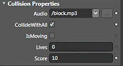 In the Collision properties section, click the Audio menu and scroll through the list until you locate block.mp3. Select this value. Now you will need to repeat this step for all of the remaining honeycombs. No shortcuts here, unfortunately!