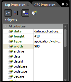 The Silverlight file appears as a blank placeholder, because you cannot see the content until you open the page in the browser. In the bottom-left side of the screen, locate the height and width attributes in the Tag Properties panel and change the height from 480 to 418 by clicking the value and typing the number. Click the width value of 640 and change it to 980. The width and height of the Silverlight placeholder change.