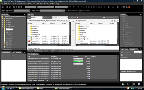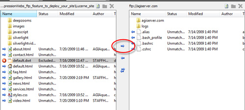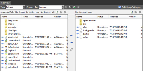 Choose Site > Publishing and the publishing window appears. Click the hyperlink to connect. Assuming the connection was setup properly, you will see your local files on the left and the remote server on the right.
