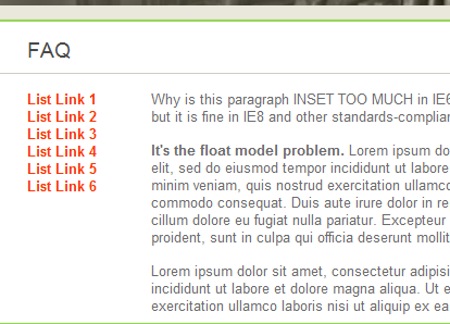 You are now comparing Internet Explorer 8 on the left, with Internet Explorer 6 on the right. Zoom out to 50% and look at the paragraph text in the FAQ section (in the center of each screen). You should immediately see a problem with the Internet Explorer 6 version. The paragraphs in the FAQ section are not wrapping around the links to their left as desired.