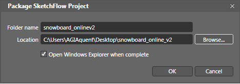 Choose File > Package SketchFlow Project. The Package SketchFlow Project window appears. In the Folder Name field type snowboard_online_v2 and then press the Browse button. Create a new folder on your desktop, name it Snowboard_online_v2 and then press Select Folder. Then click OK.