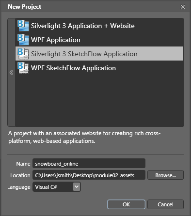 From the File > New Project dialog box, choose Silverlight 3 SketchFlow application. Type the name snowboard_online into the Name textbox.