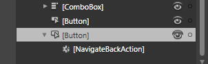 In the Objects and Timeline panel, locate the highlighted button. Click the arrow to the left to expand it. Nested within will be the [NavigateBackAction] behavior.