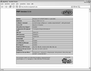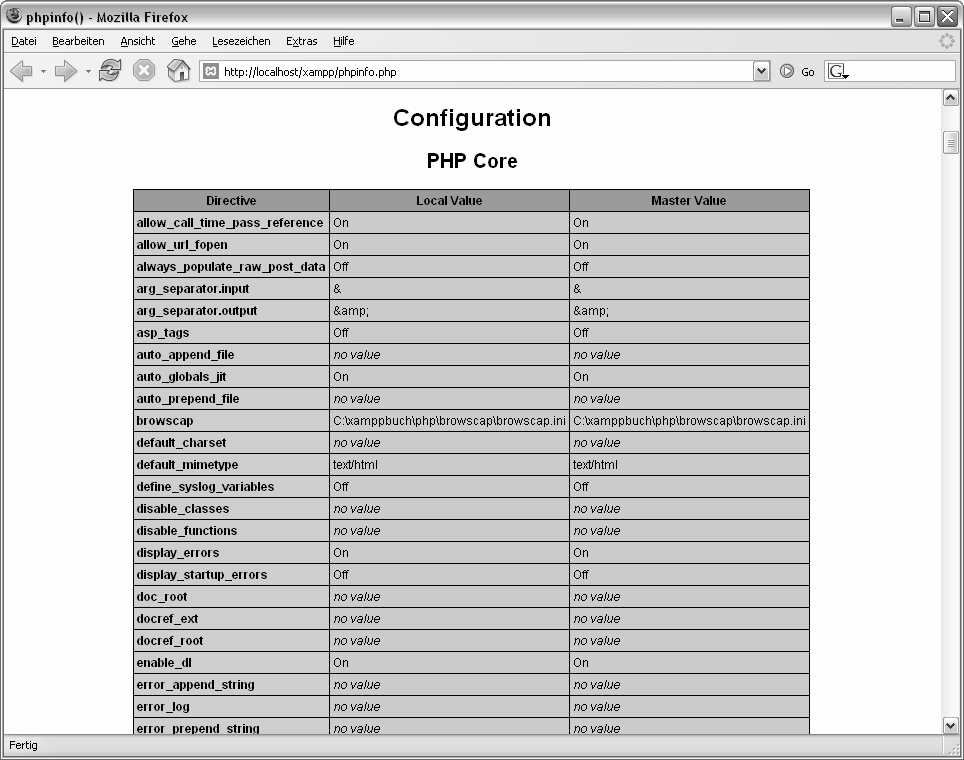 Mithilfe des Befehls phpinfo() können Sie die Konfiguration überprüfen. Die folgenden Abbildungen zeigen eine typische Konfiguration mit sämtlichen Werten, die phpinfo() erzeugt.