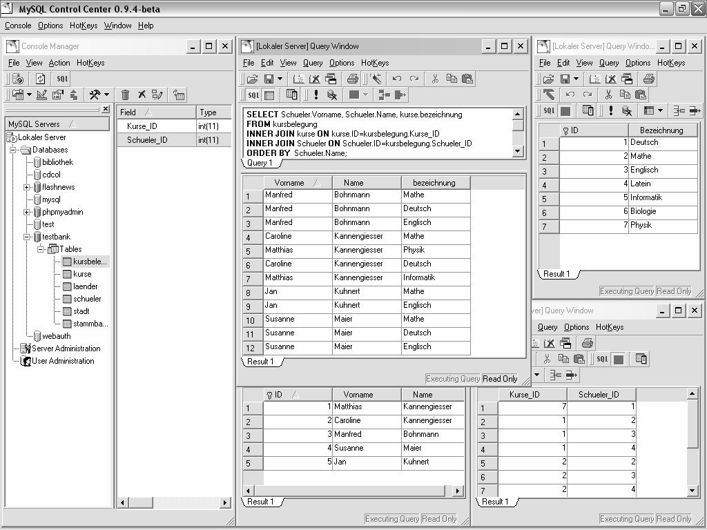 Bild 7.5: Kursbelegung, Schüler und Kurse unter Kontrolle in MySQLCC