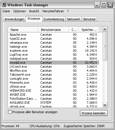 Unter Windows sollte ein entsprechender Eintrag (mysqld.exe) in der Taskleiste vorhanden sein.